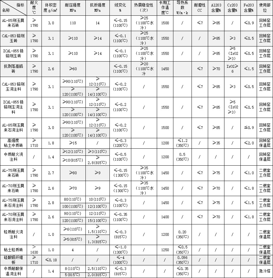 注:回轉窯襯里可按用戶要求制成剛玉莫來石復合磚、鉻剛玉復合磚等。